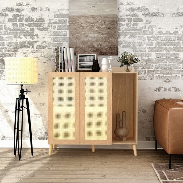 If keeping your home tidy feels like an uphill battle, call in reinforcements with this accent chest. This beech solid and manufactured wood cabinet adds a touch of retro to your space with accent molding and faux cane doors. It sits on four bun feet for a traditional feel, and its shelved storage space sits behind two faux cane doors. Which spring design makes us close the door without a handle. Use this chest as a catch-all in your entryway or to store linens in your hallway.