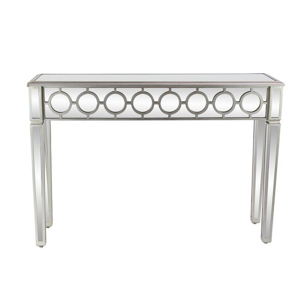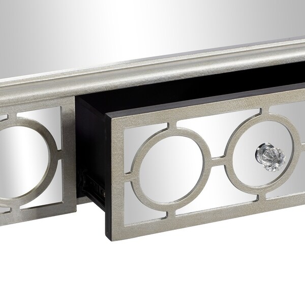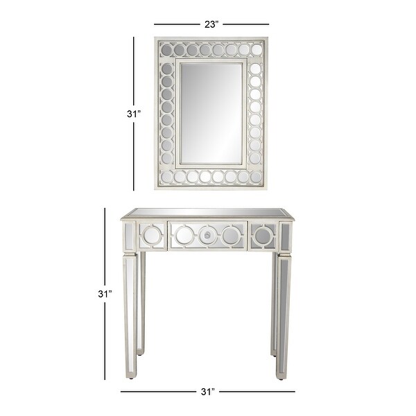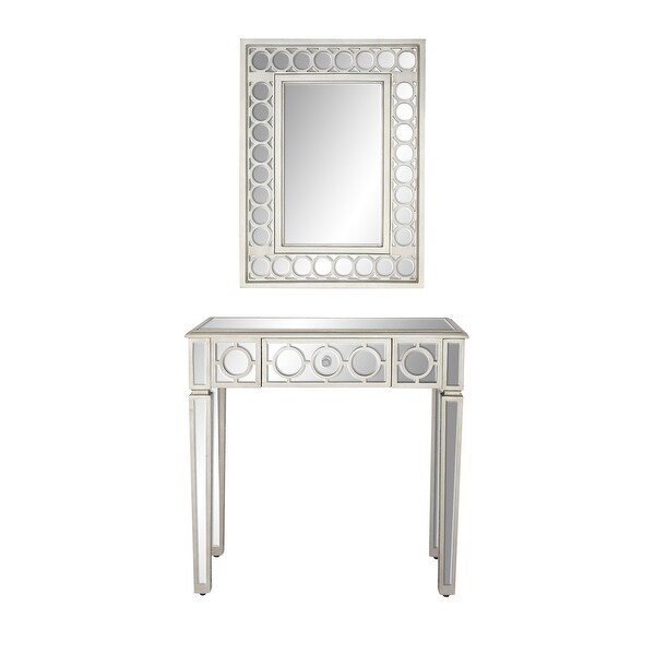 Bring a finishing touch to your home with an inviting appeal with this console table. A sturdy and long lasting construction for a years of enjoyment. Decorate this wall mirror and console table set with a bouquet of fresh flowers and ceramic lamp for the perfect glam look. This item ships in 1 carton. Silver console table with mirror features a single drawer. Includes both a console table and matching wall mirror. Suitable for indoor use only. Some assembly required. Maximum weight limit is 100 lbs. This console table with mirror comes as a set of 2. Glam style. 23" x 31" Silver Wood Mirrored Geometric Single Drawer Console Table with Mirror, 2-Pieces